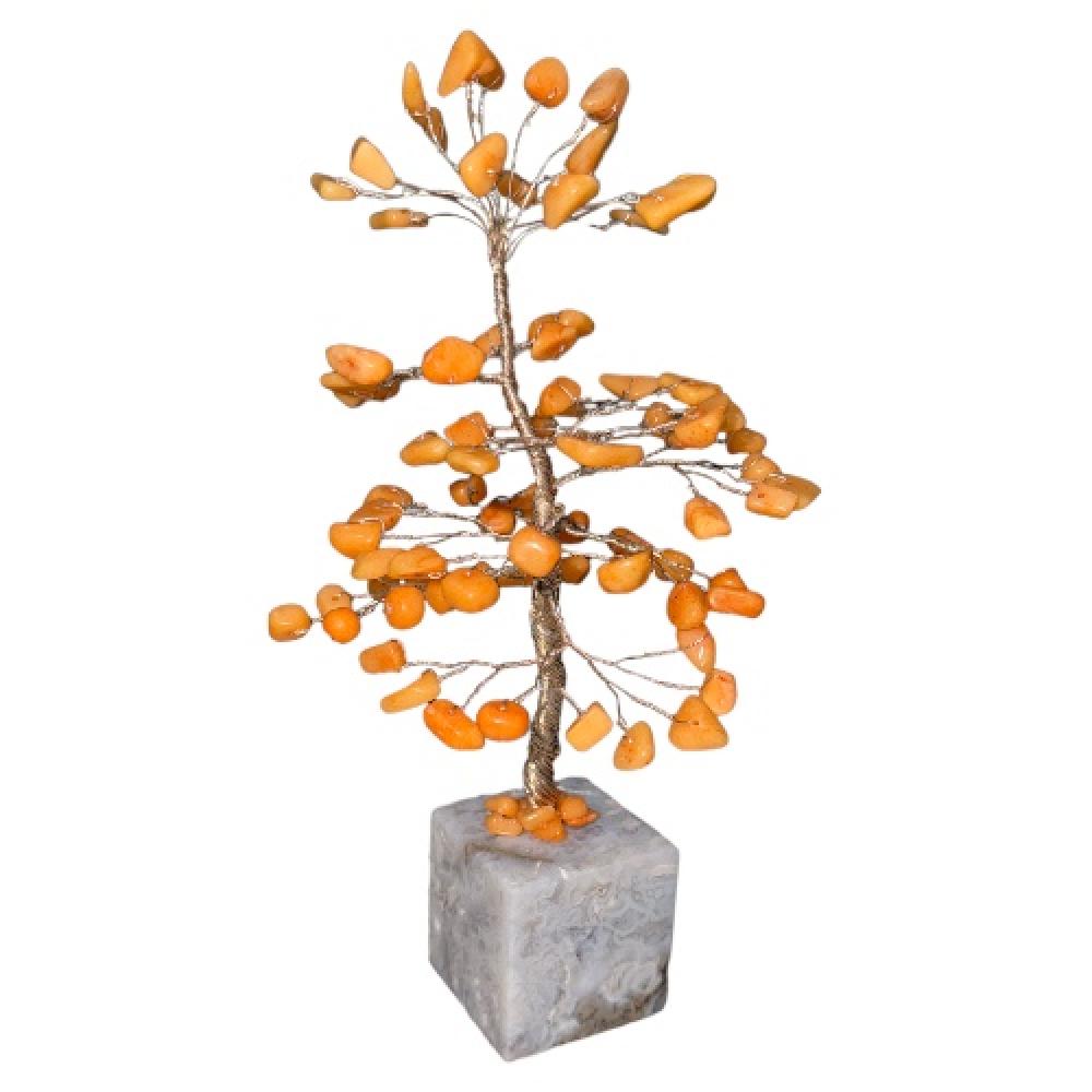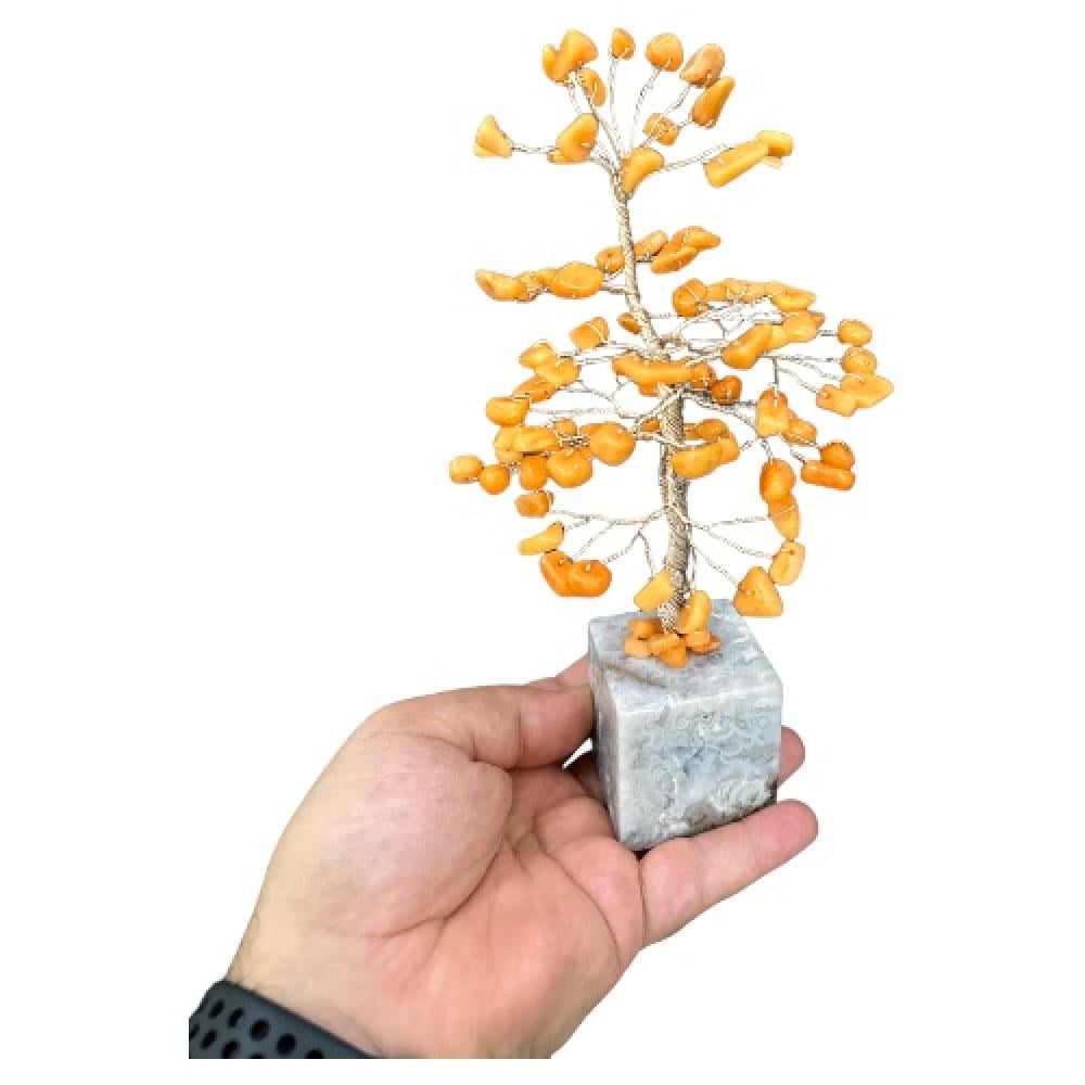 حجر عقيق طبيعي تم دمجه مع قطع حجرية وتم تشكيلها بطريقة فنية لتعطي طابع شجرة لِتُكوّن التكوين الفني الكامل للتحفة.